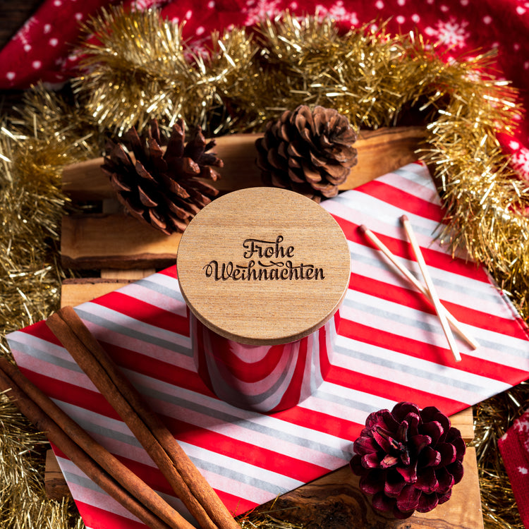 Répandez la joie et adoptez la magie d'un Noël allemand avec notre couvercle de bougie Frohe Weihnachten !